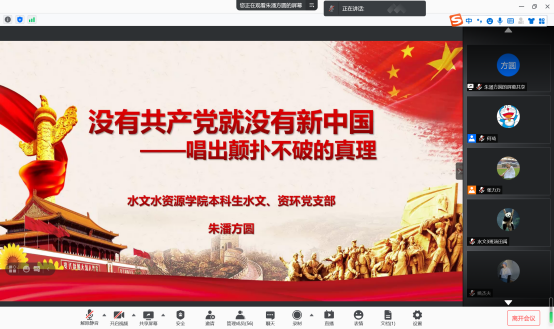 第三位朱潘方圆同志从作者介绍、创作背景、传播传唱以及歌曲意义向各位党员同志带来了《没有共产党就没有新中国》一曲的分享,歌曲传达了广大人民群众对中国共产党的衷心拥护和跟党走的坚定信念,唱出了只有中国共产党才能领导中国人民争取国家独立、民族解放、人民幸福的历史必然。