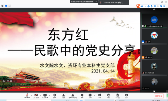2021年4月14日晚七点半,注册送体验金 水文、资环专业本科生党支部“民歌中的党史” 音诗画分享会主题党日活动如期开展,支部书记张力力同志主持了本次分享会,支部全体党员同志参与本次主题党日活动。